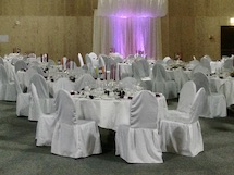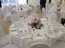 Vita stolsöverdrag till våra kläddastolar i blått.